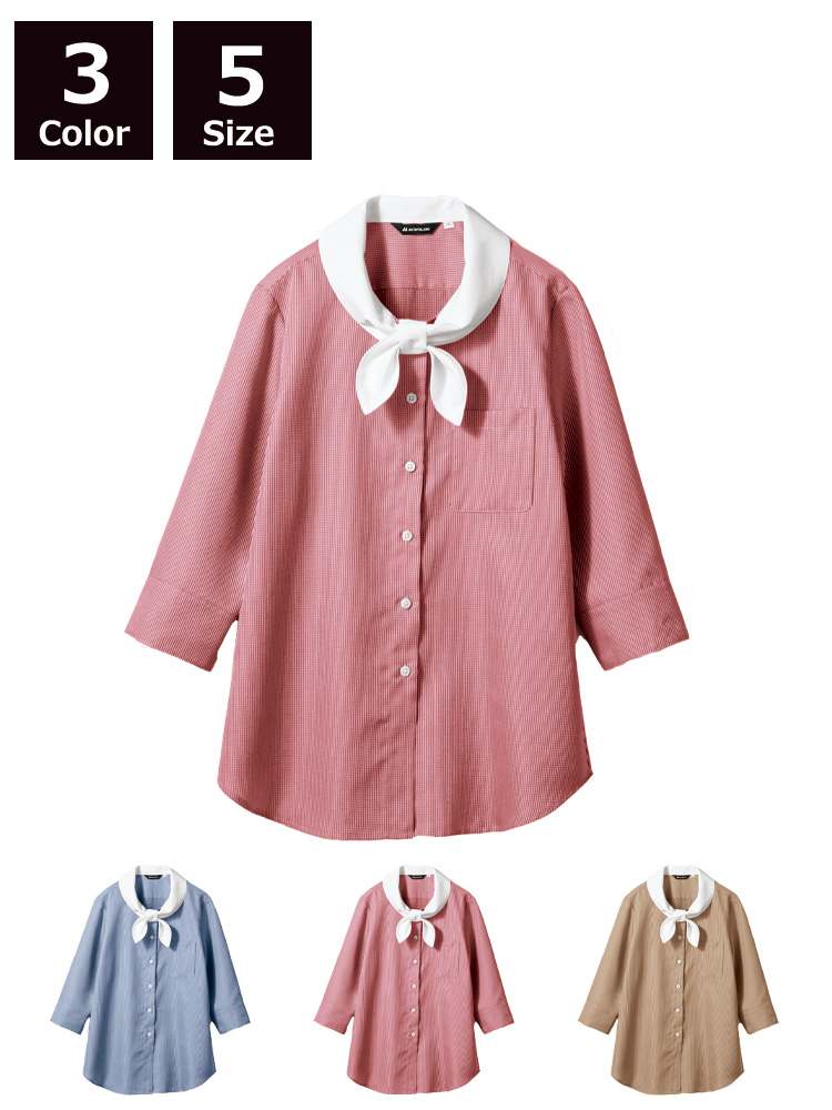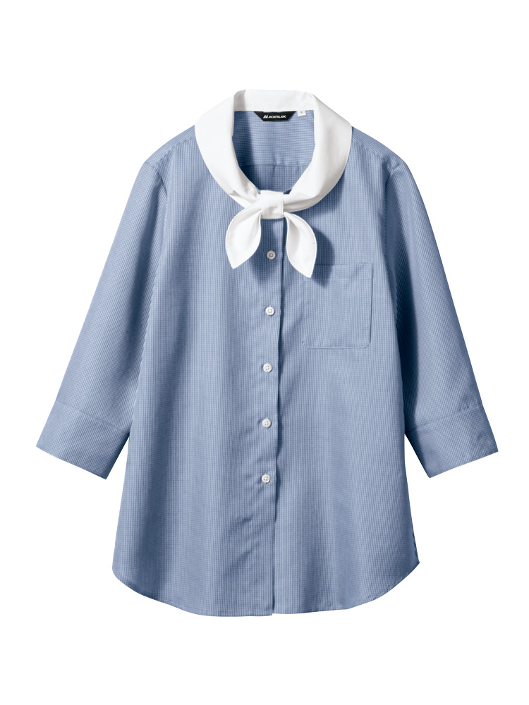 白い襟が目を引く、クレリックシャツ。