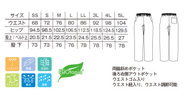 両脇斜めポケット、後ろ両側アウトポケット、ウエストゴム、ウエスト紐